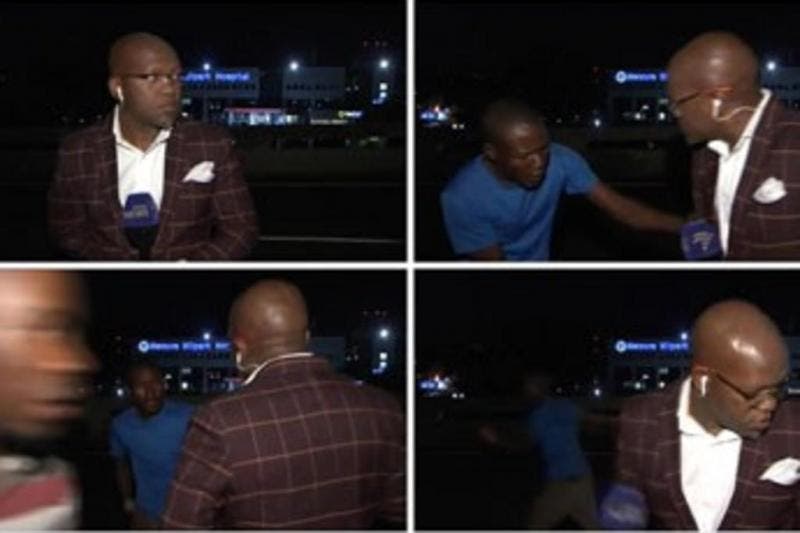 As imagens mostram os homens andando em volta do repórter Vuyo Mvoko enquanto ele fala para a câmera. Em seguida acontece uma confusão e Mvoko é ouvido gritando “Ei, estamos sendo roubados.”