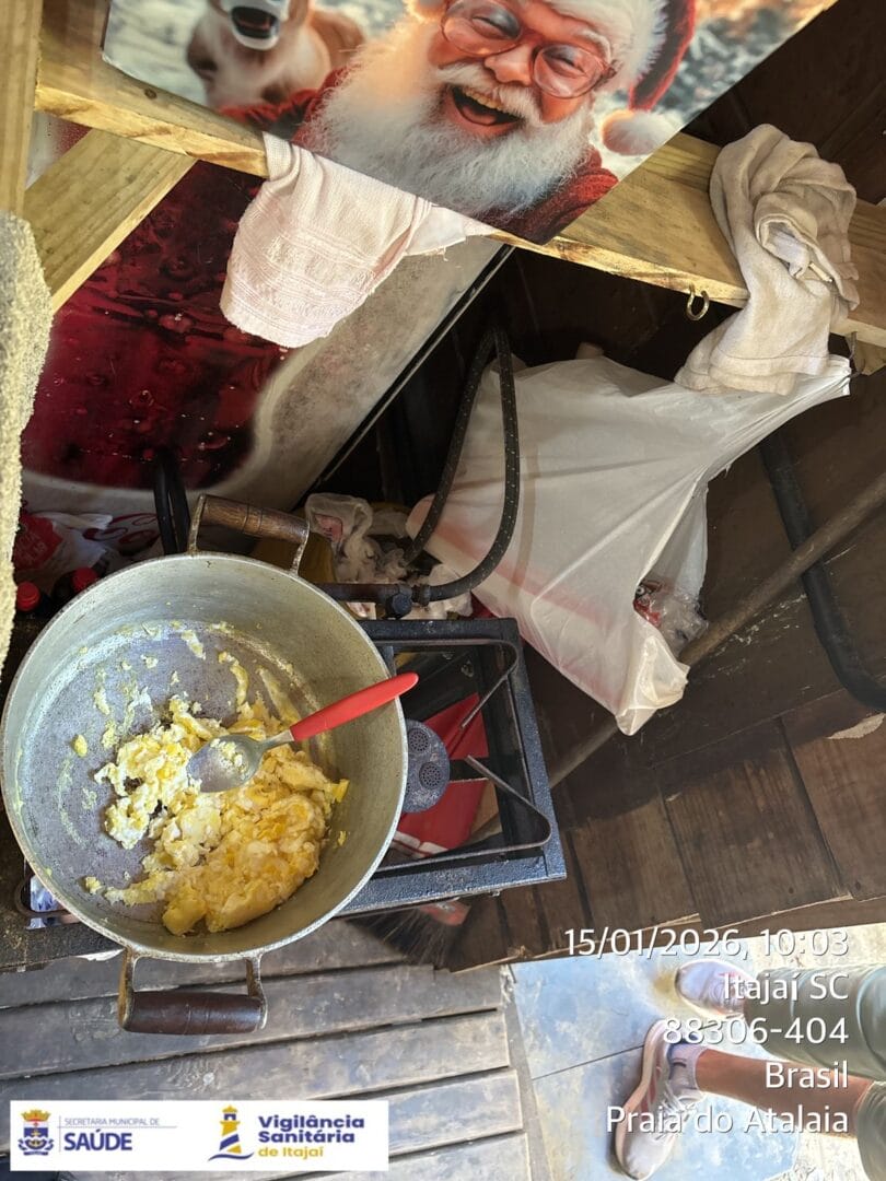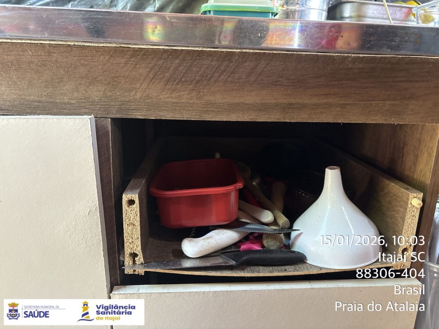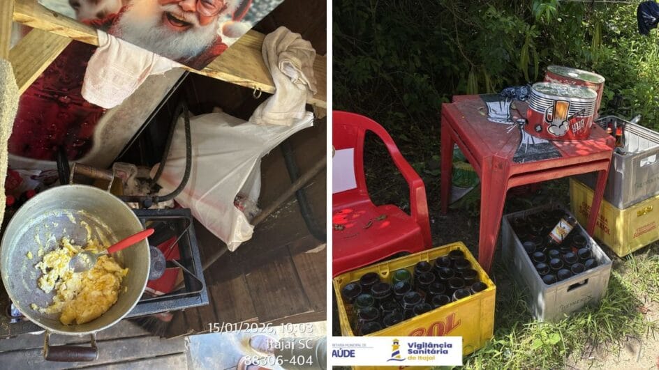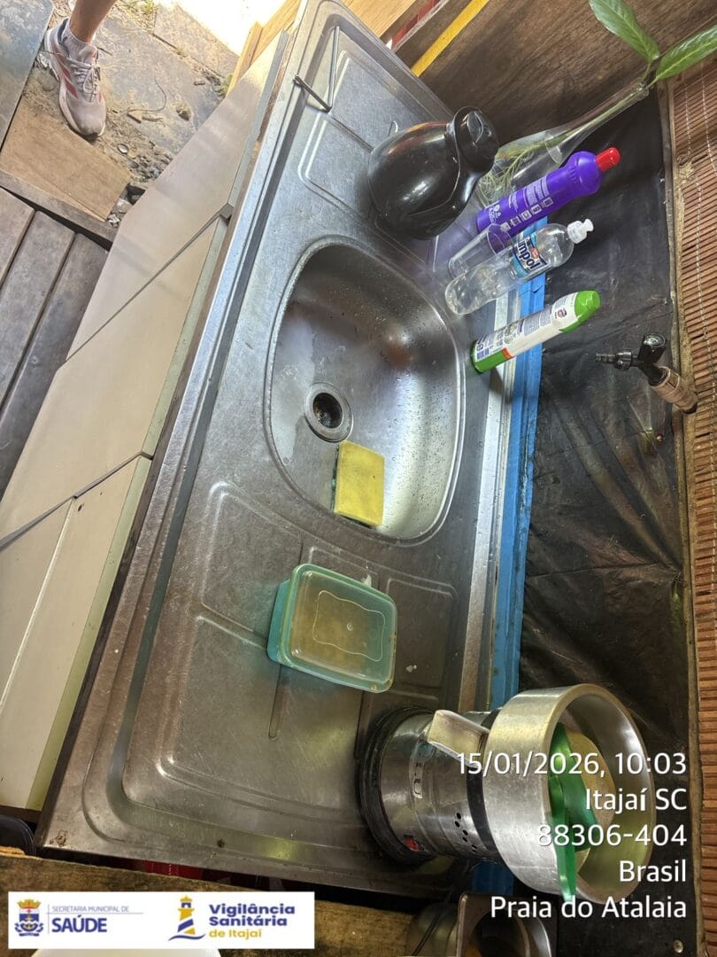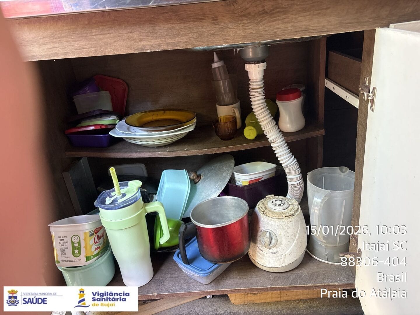 Os fiscais foram até o local no bairro Cabeçudas por volta das 10h e flagraram uma série de irregularidades. O estabelecimento também não cumpria com as normas de limpeza e armazenamento de alimentos. As imagens registradas pelas equipes da vigilância mostram freezers de bebidas com sujeira acumulada, panelas com resto de comida expostas e sem armazenamento adequado, utensílios de cozinhas sujos e guardados em armários quebrados.