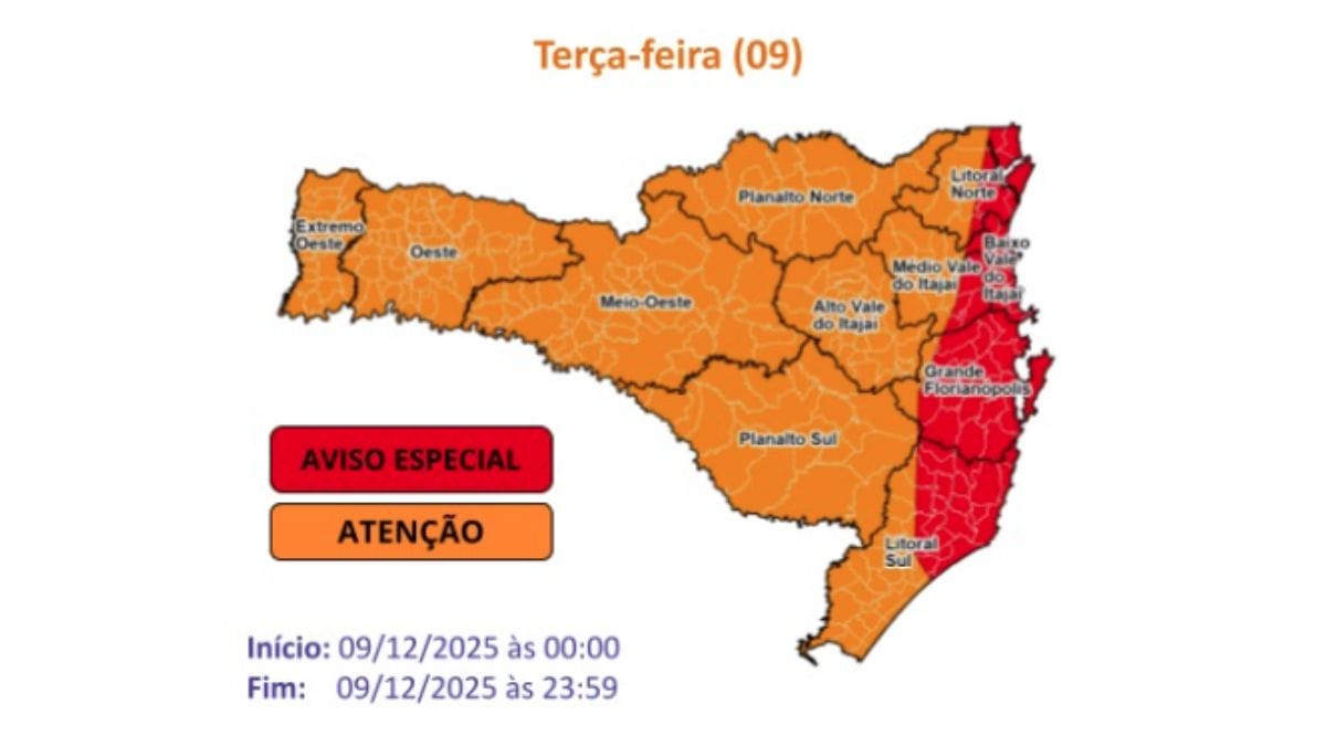Segundo o monitoramento realizado pela Defesa Civil estadual, a atuação de um ciclone extratropical deixa o tempo instável em toda Santa Catarina. Para a região de Joinville, o alerta inicia na madrugada desta terça-feira (9), quando as instabilidades se intensificam, com chuva persistente e por vezes intensa, em curtos períodos.