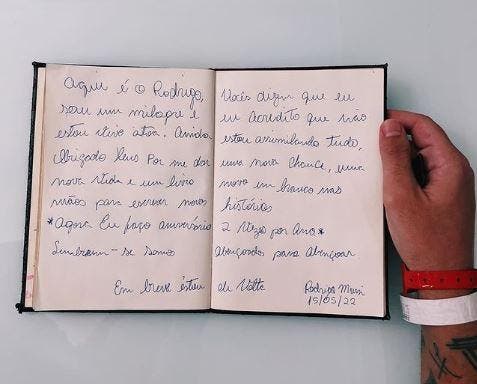 “Agora eu faço aniversário 2 vezes por ano. Lembrem-se somos abençoados para abençoar. Em breve estou de volta”, prometeu Rodrigo, mostrando uma foto do caderno no qual escreveu a mensagem.