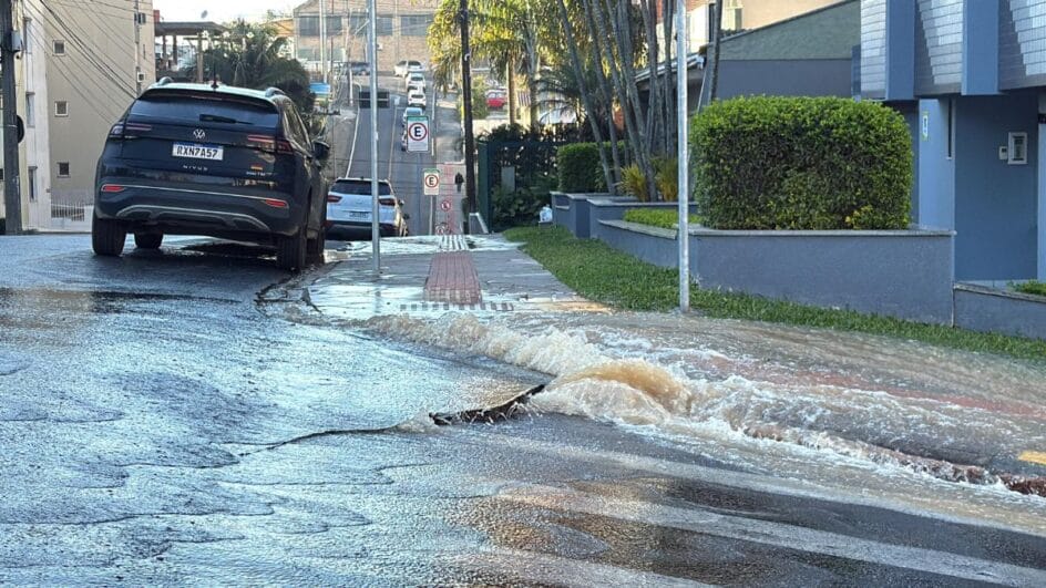 Imagens mostram uma “cachoeira” se formando na rua Lauro Müller após o rompimento do sistema de tubulações, que causou uma rachadura no asfalto. O volume de água no local diminuiu e equipes da Companhia Catarinense de Águas e Saneamento (Casan) já trabalham na manutenção.