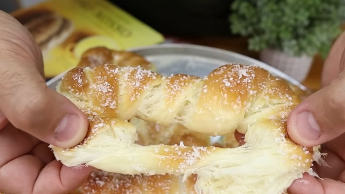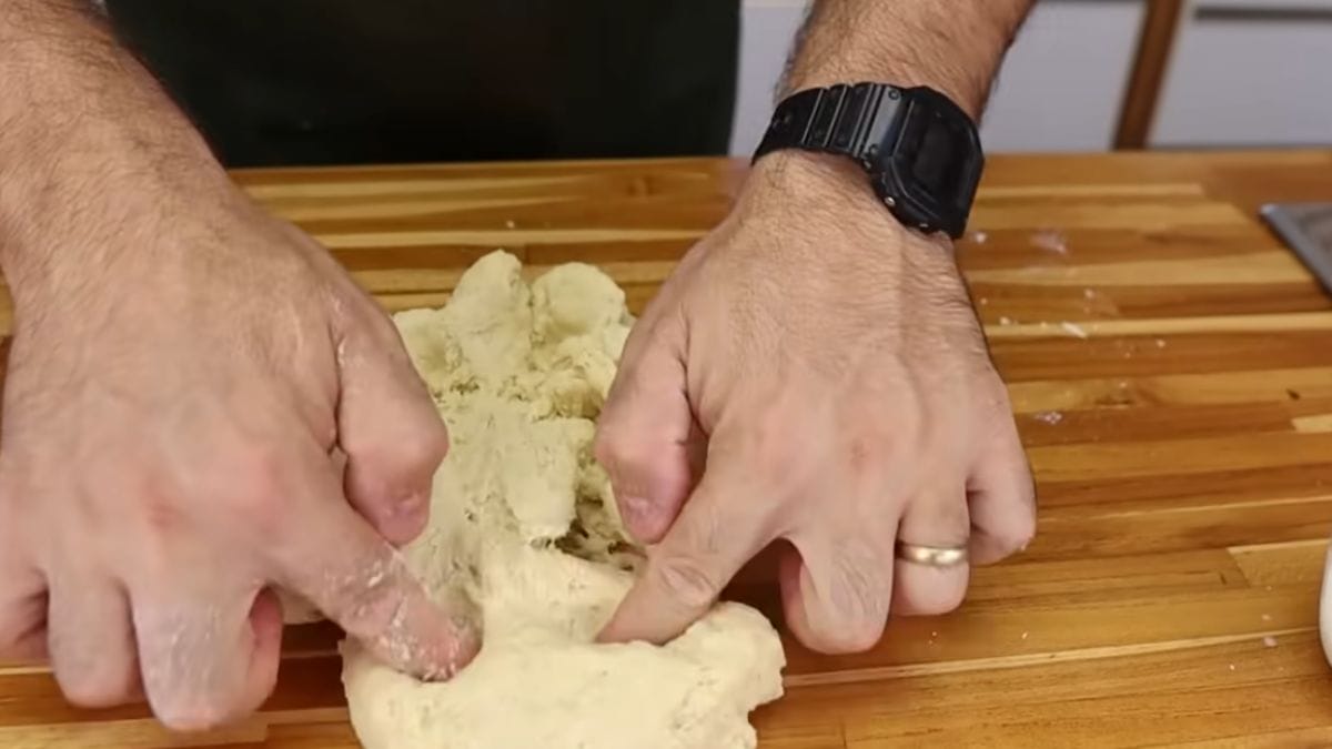 - Após o descanso, divida a massa em porções de aproximadamente 70g. Abra cada pedaço em formato de corda, faça um nó e enrole as pontas para dentro para criar o formato charmoso de rosquinha;
