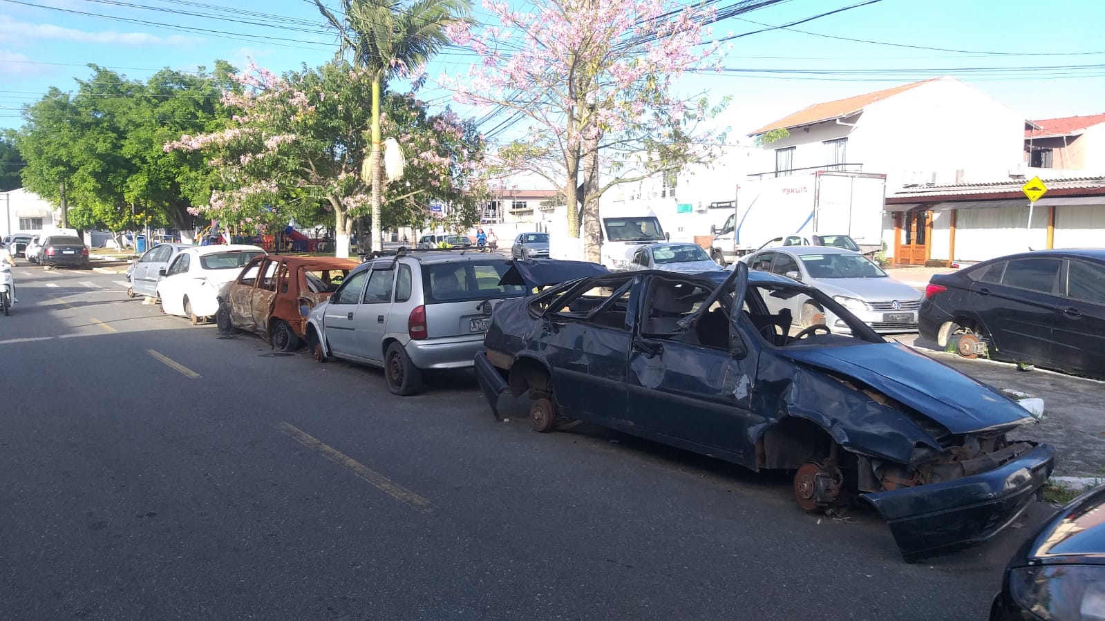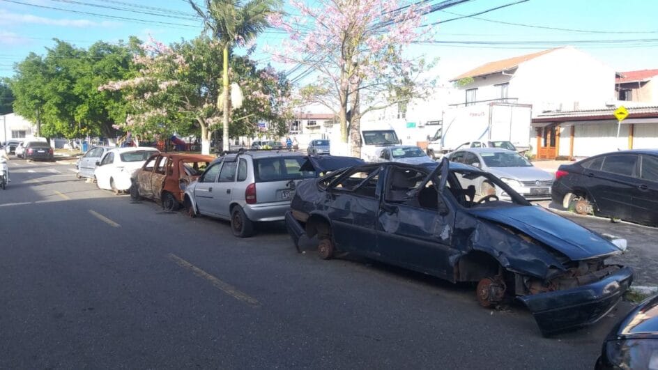 Na Rua Paraguai e vias do entorno, a reportagem da NSC TV contou pelo menos 42 veículos espalhados pelo quarteirão. Moradores relatam que os carros chegam inteiros, mas acabam sendo depredados à luz do dia. Há alguns sem rodas, com portas abertas, vidros quebrados, peças arrancadas e com marcas de incêndio.