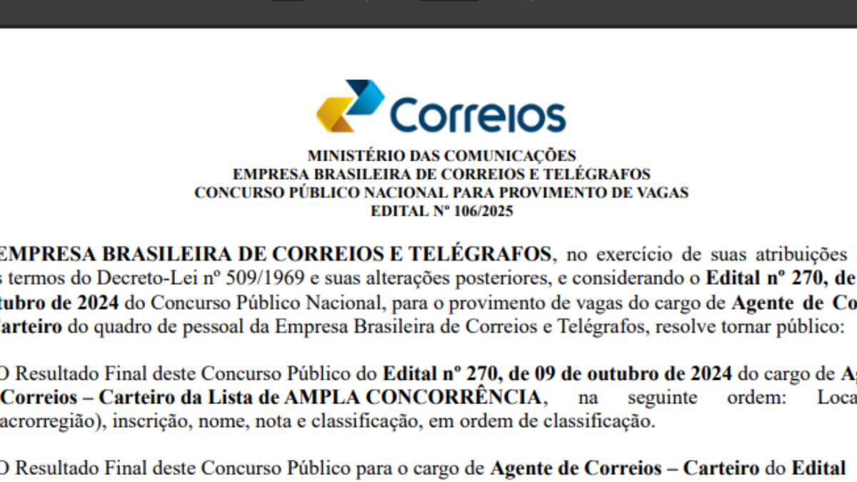 O resultado final dos candidatos aprovados no concurso dos Correios foi homologado nesta segunda-feira (14) pela estatal e já está disponível para consulta no site do certame. A convocação dos aprovados deve ser feita no prazo de validade do concurso, de um ano, que pode ser prorrogado uma vez por igual período, segundo nota.