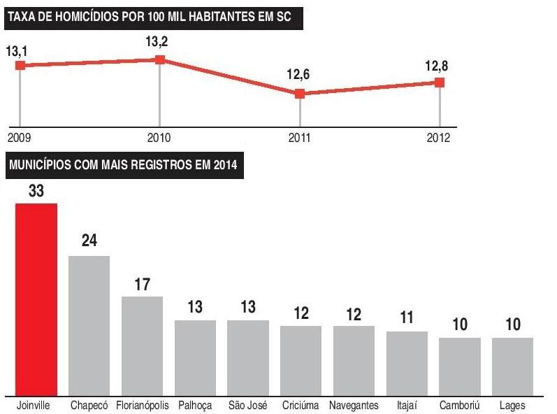 A taxa de homicídios é o principal indicador mundial para avaliação e diagnóstico de criminalidade e violência. Segundo dados prévios do Mapa da Violência 2014, divulgados pela Área de Estudos da Violência da Faculdade Latino-Americana de Ciências Sociais (FLACSO), Santa Catarina teve taxa de homicídios de 12,8 por 100 mil habitantes. em 2012.