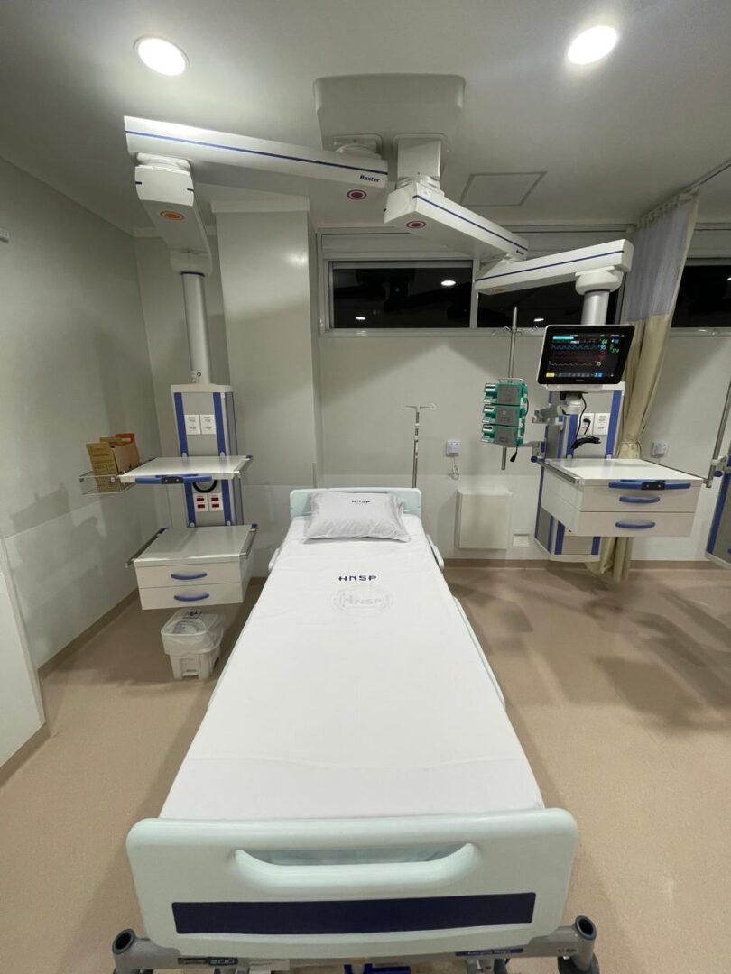 Quanto à estrutura do leito, a instalação das estativas, que são móveis suspensos no teto, facilitam a higienização, a rotina da equipe, a segurança do paciente e a ergonomia dos trabalhadores. Já as novas camas possuem recursos que reforçam a segurança e a humanização dos nossos pacientes, como balança integrada para acompanhamento do peso, alarmes de evasão e de movimento para evitar quedas, além de suportes de chassi de Raio-X integrados, para um melhor cuidado e manejo mínimo. Enquanto isso, todos os ventiladores pulmonares presentes na UTI são de alta performance, e o uso de softwares auxilia na automatização do cuidado ventilatório, como o recrutamento alveolar.