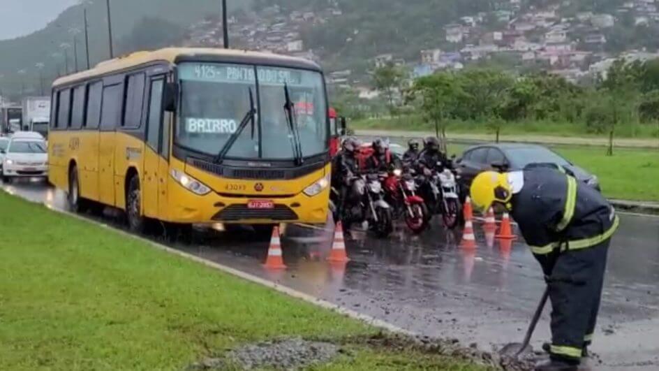 A rodovia SC-401, que corta o Oeste da Ilha de Santa Catarina, acumula transtornos aos motoristas ao longo desta chuvosa segunda-feira (19). Na altura do elevado da Vargem Pequena, no Norte de Florianópolis, a pista principal está alagada e há condições de tráfego apenas na faixa mais à direita. Por conta do fluxo em meia-pista, motoristas enfrentam lentidão no trecho — por volta das 16h30, a fila de veículos se estendia por quatro quilômetros a partir do acesso a Jurerê.