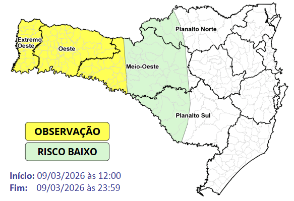 O aviso abrange todo o estado de Santa Catarina. Apenas três estados do Brasil não estão inclusos no alerta: Bahia, Alagoas e Sergipe.