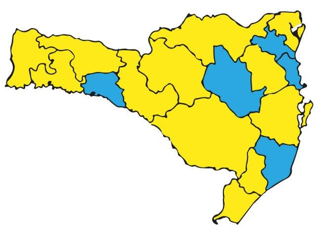 Cinco regiões de Santa Catarina foram classificadas com risco moderado (azul) para a Covid-19. É o que aponta a matriz de risco potencial regionalizada divulgada neste sábado (5) pela Secretaria de Estado da Saúde (SES). Outras 12 continuam em nível alto (amarelo).