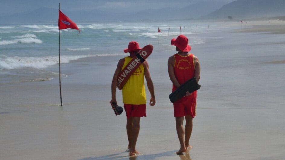 - Preste atenção especial à sinalização na faixa de areia, em que a bandeira vermelha triangular significa que aquele local é perigoso. A mesma bandeira normalmente sinaliza, também, que há uma corrente de retorno;