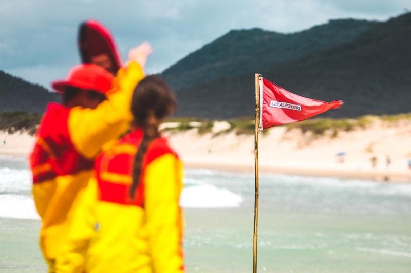 – Nas praias, todos os dias, os guarda-vidas verificam as condições do mar e sinalizam os riscos por meio das bandeiras vermelhas. Os principais riscos são as correntes de retorno. Procure nadar nos locais que têm guarda-vidas, afastado das bandeiras vermelhas;