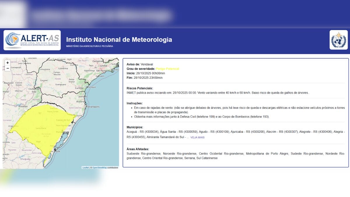 Além dos ventos costeiros, o Inmet emitiu um aviso amarelo de perigo para vendaval em alguns municípios de Santa Catarina. O alerta aponta ventos de 40 km/h e 60 km/h. Há risco baixo de queda de galhos de árvores.