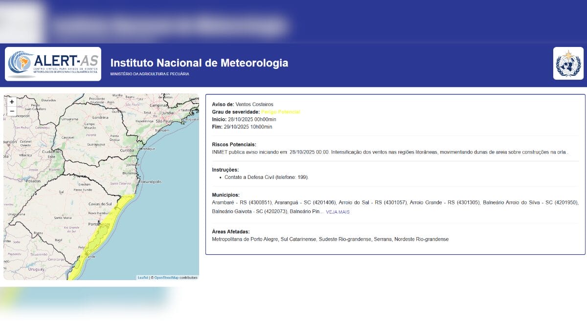 O Sul e a Serra de Santa Catarina está em alerta amarelo de “perigo potencial” para ventos costeiros, de acordo com o Instituto Nacional de Meteorologia (Inmet). O aviso, publicado a meia-noite desta terça-feira (28), segue até às 10h de quarta (29). Alguns municípios da Serra também estão inclusos no alerta.
