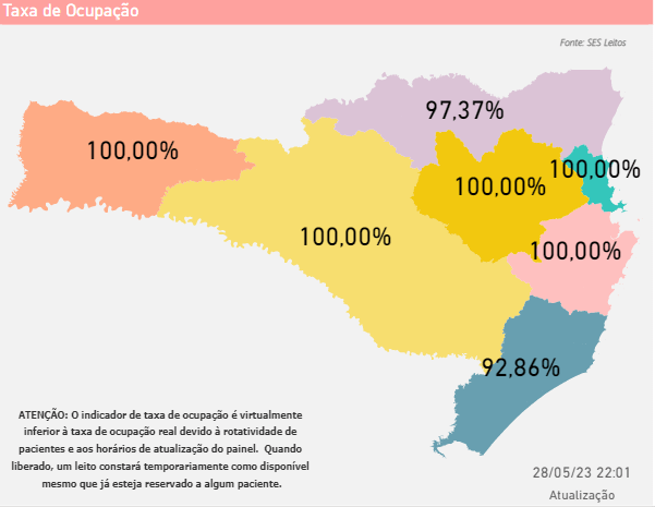 Por fim, em relação aos adultos, apenas três regiões não possuem vagas para internação: Grande Oeste, Vale do Itajaí e Foz do Rio Itajaí. A taxa geral é de 99,28%.