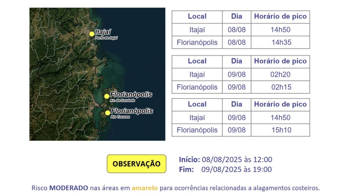 A Defesa Civil de Santa Catarina emitiu um novo alerta para a elevação da maré entre a tarde desta sexta-feira (8) e a madrugada e tarde do sábado (9). Áreas da Grande Florianópolis e do Litoral Norte têm risco moderado de alagamentos costeiros, conforme o órgão.