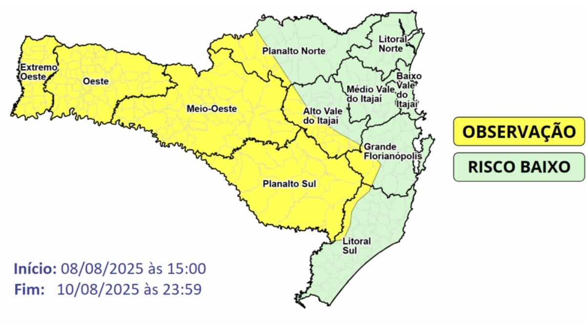 Santa Catarina viverá um “caos climático” nos próximos dias. A Defesa Civil também emitiu um alerta de mar agitado e risco de ressaca entre a sexta e o domingo (10), devido ao ciclone extratropical, principalmente entre o Litoral Sul e Florianópolis. O vento Sul deve se intensificar em todo o litoral, com rajadas entre 50km/h e 70 km/h e ondas entre 2,5 e 3,5 metros, podendo ser ainda maiores em alto mar.