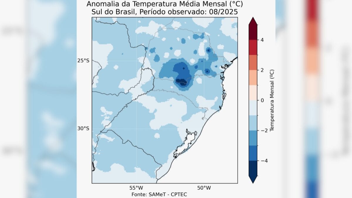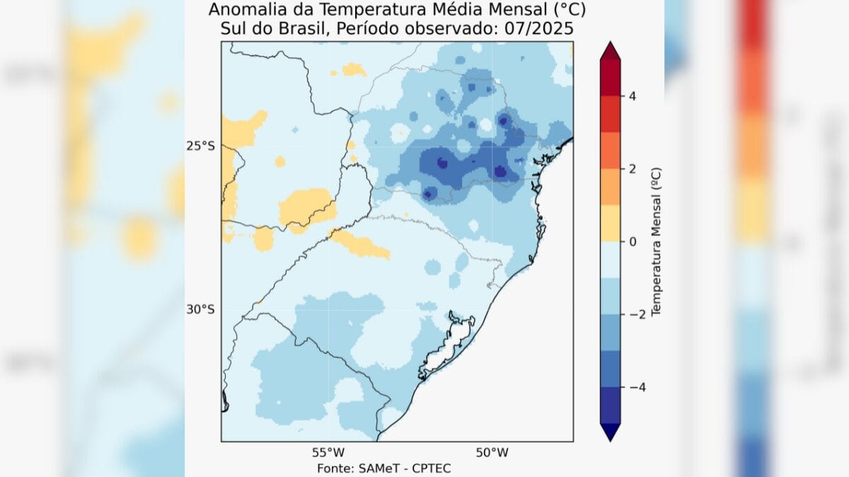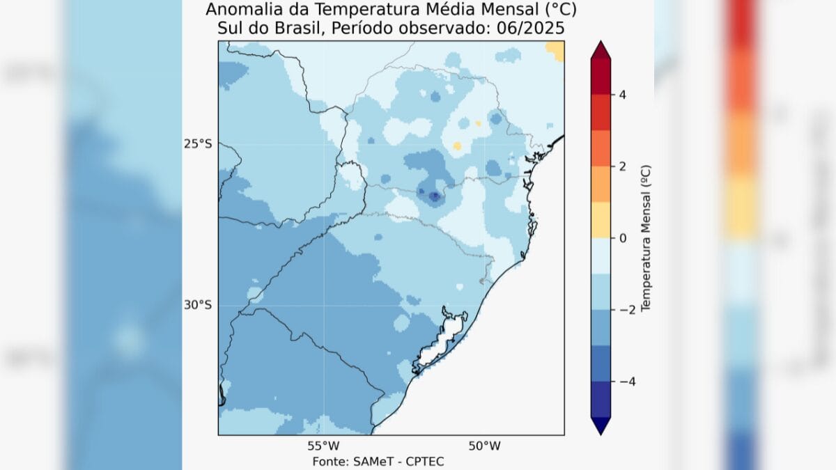 Mapas de anomalia de temperatura mostram que o Estado ficou com a temperatura média entre 1°C e 1,5°C abaixo da expectativa climatológica para o período. Segundo o professor, a persistência e a intensidade dessas massas ao longo do ano são a causa do fenômeno.