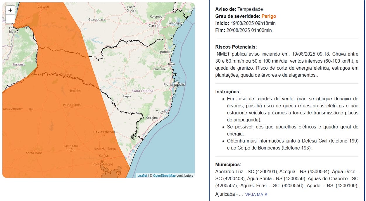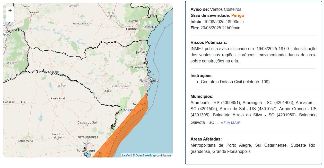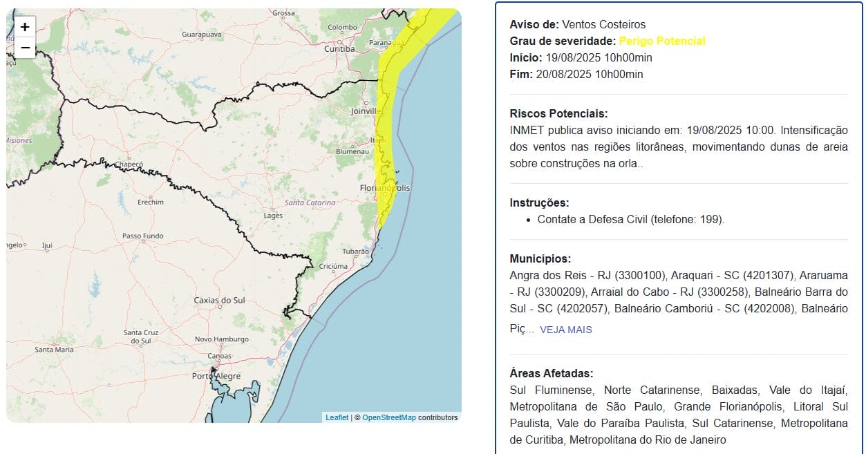 Também há um aviso de ventos costeiros entre a Grande Florianópolis e o Litoral Norte, até 10h de quarta-feira. No mesmo horário, há risco de temporal na Serra, o Sul, o Meio-Oeste, a Grande Florianópolis e o Planalto Norte.