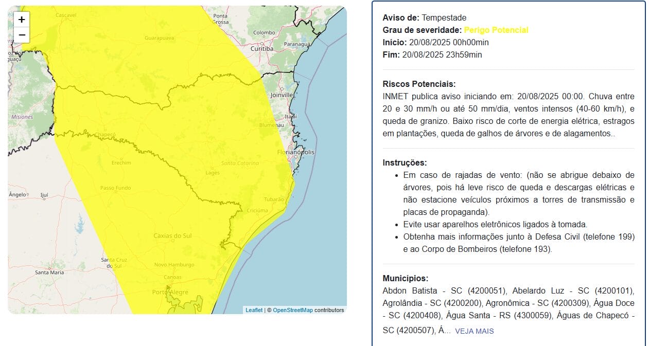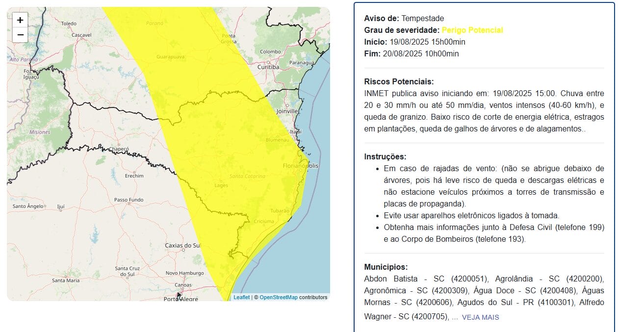 Os outros alertas são amarelos e indicam “perigo potencial”. Em quase todo o Estado, exceto o Litoral Norte e Florianópolis, há um alerta de tempestade até 23h59min de quarta-feira, com possibilidade de chuva de até 50 mm/dia, ventos intensos (40-60 km/h), e queda de granizo.