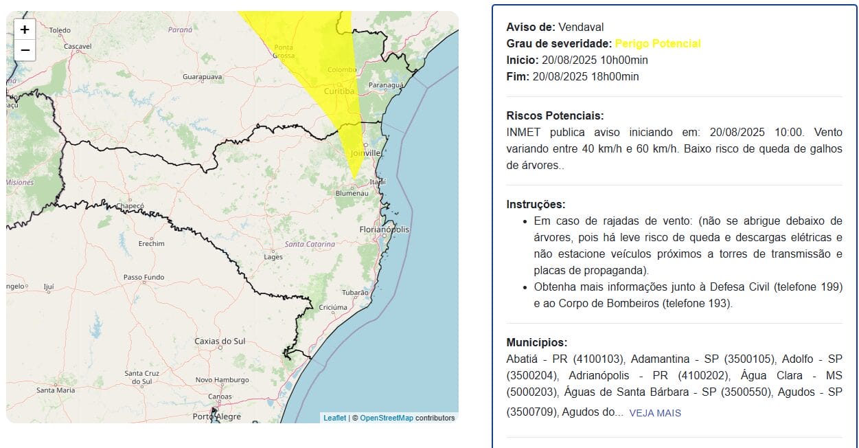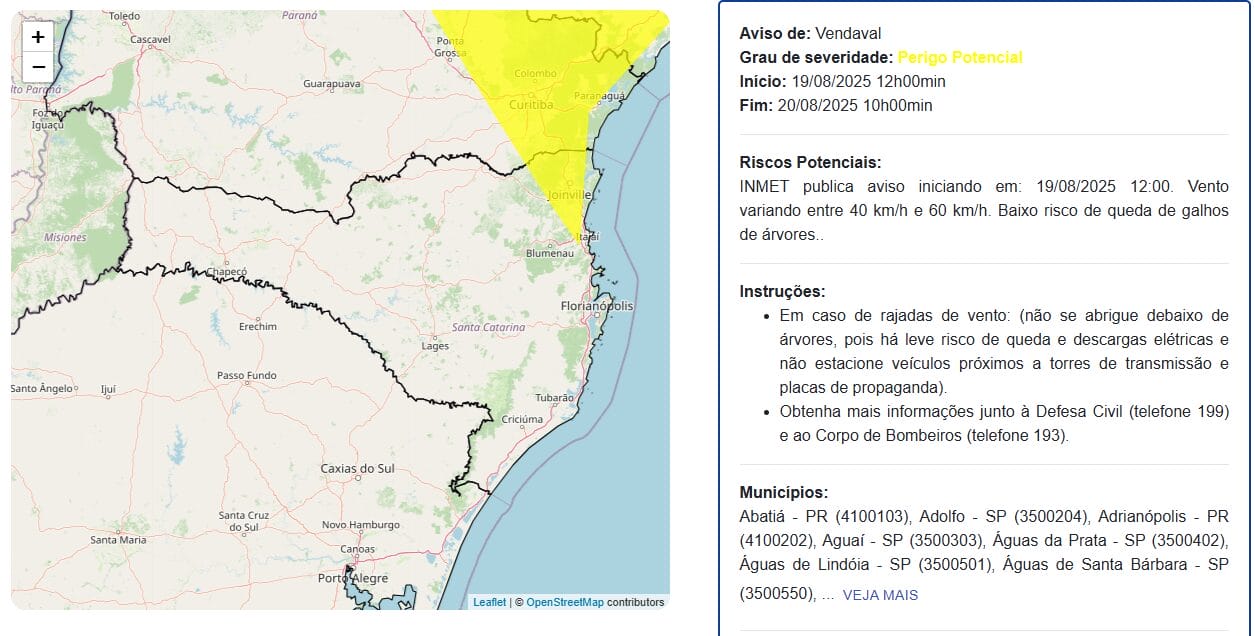 No Litoral Sul, há um alerta laranja de “perigo” para a intensificação dos ventos nas regiões litorâneas e para a movimentação de dunas de areia sobre construções na orla, válido entre as 18h desta terça e as 21h de quarta. Outro alerta laranja, vigente até 1h de quarta para a região Oeste, indica tempestade com chuva de até 100 mm/dia, ventos intensos (60-100 km/h), e queda de granizo.