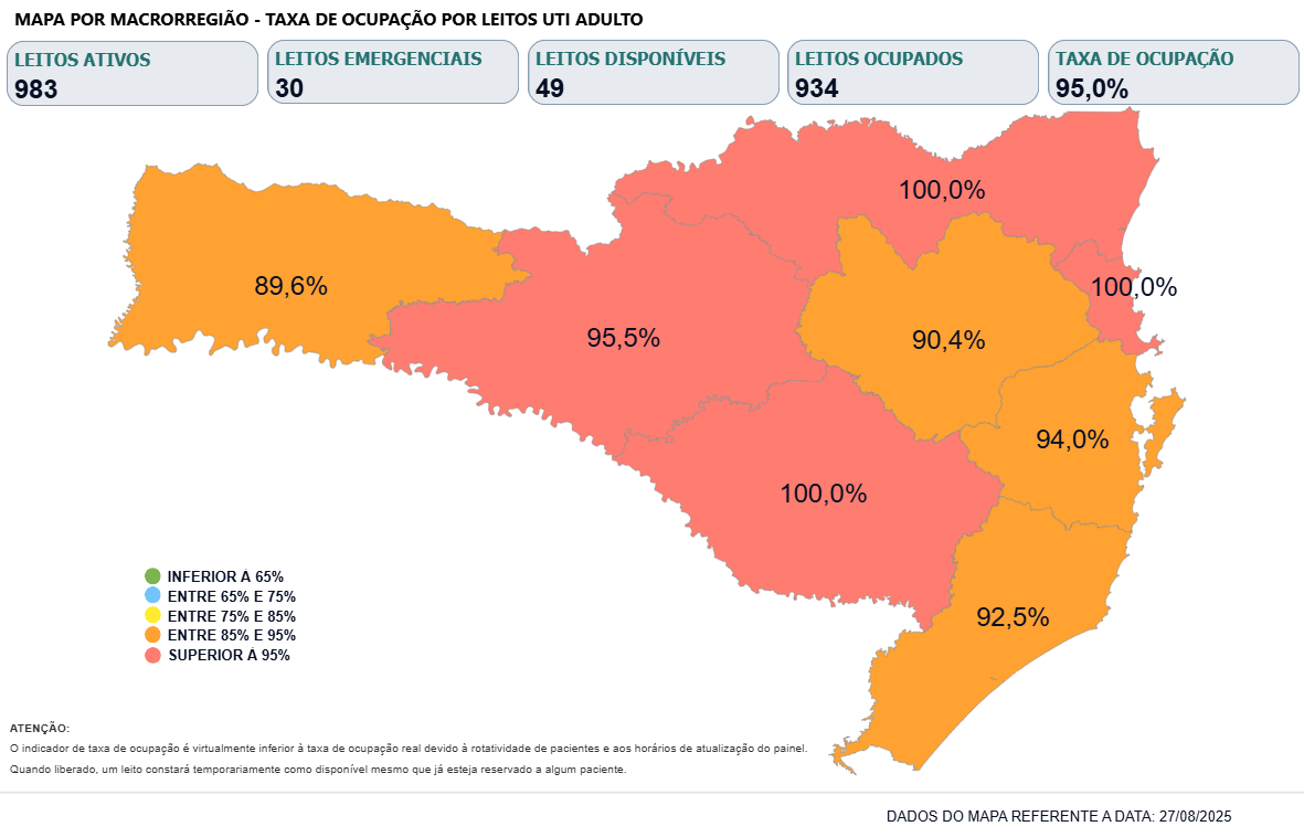 A média de ocupação em todo o Estado é de 95%, com apenas 49 leitos disponíveis entre os 983 ativos. A Grande Florianópolis, o Vale do Itajaí, o Sul e o Meio-Oeste têm taxas de ocupação superiores a 90%. Já o Oeste tem média de 89,6%.