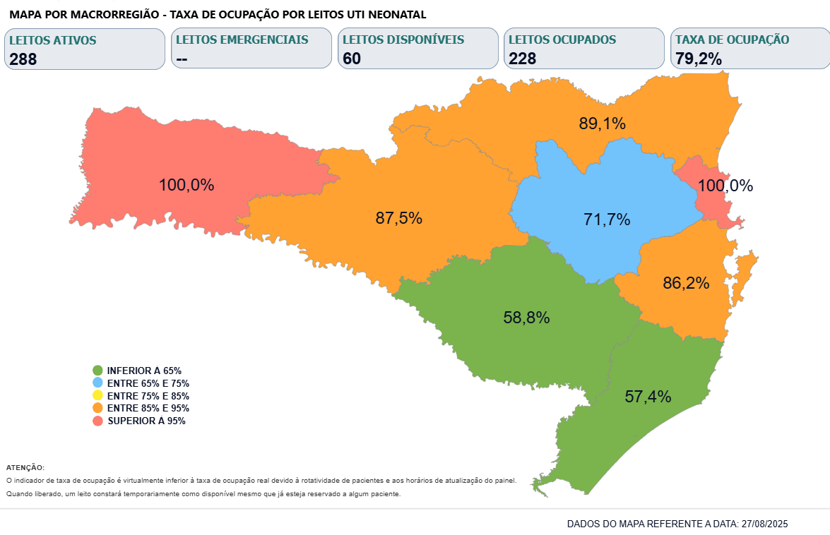 A situação dos leitos neonatais também gera alerta, com taxa média de ocupação de 79,2% e duas regiões sem leitos: Oeste e Foz do Rio Itajaí. A Grande Florianópolis, o Meio-Oeste e a região Planalto Norte e Nordeste têm mais de 85% dos leitos ocupados, enquanto o Vale do Itajaí tem 71,7% de ocupação. As demais regiões não apresentam risco.