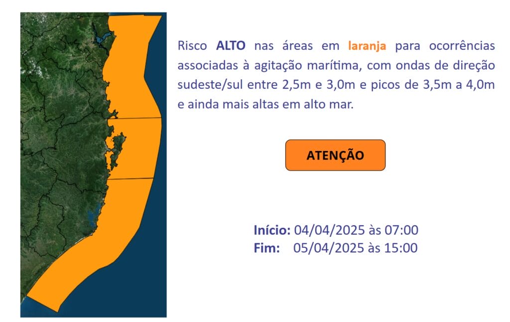 Entre sexta-feira e sábado, o mar ficará muito agitado com a intensificação dos ventos de quadrante Sul, de acordo com a Defesa Civil. São esperadas ondas de direção Sudeste/Sul, entre 2,5 e 3 metros, com picos de 3,5 a 4 metros.