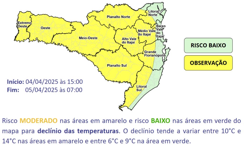 Santa Catarina terá uma reviravotla no tempo nos próximos dias. Nesta quinta-feira (3), a Defesa Civil emitiu uma série de alertas indicando queda acentuada de temperatura, agitação marítima e fortes ventos entre sexta-feira (4) e sábado (5).