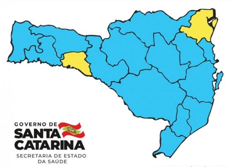 Santa Catarina voltou a ter duas regiões no nível alto (cor amarela) no mapa de risco da Covid-19 após três semanas consecutivas com todo o Estado no moderado (cor azul). A atualização da Secretaria da Saúde foi divulgada neste sábado (1).