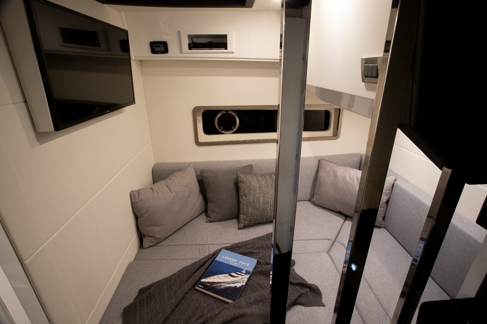 As amplas janelas laterais da sala reforçam a sensação de liberdade e conexão com o mar. No comando, os sensores e sistemas de navegação avançados garantem precisão, controle e segurança, mesmo em velocidades mais elevadas.