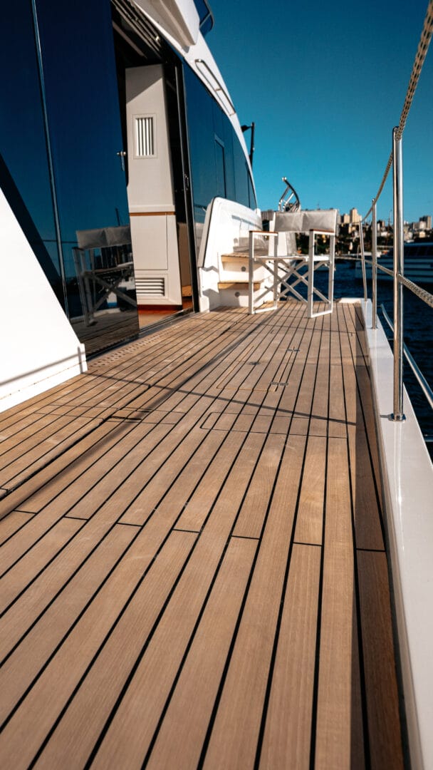 Com mais de 23 metros de comprimento e 5,91 metros de boca, o modelo tem uma presença marcante e estabilidade sentida durante toda a navegação. A capacidade de combustível de 4.450 litros e os 1.400 litros de água doce garantem autonomia para longas jornadas com absoluta tranquilidade.