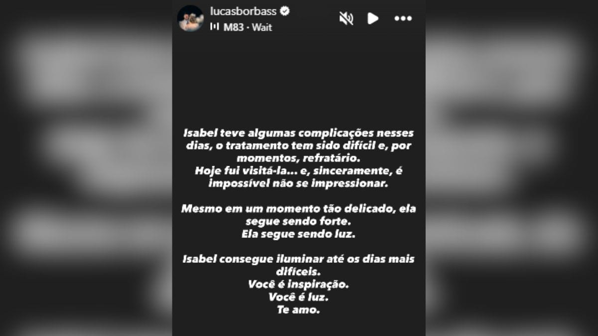 “Isabel teve algumas complicações nesses dias, o tratamento tem sido difícil e, por momentos, refratário”, escreveu. Na sequência, Lucas conta que esteve com a esposa no hospital e destacou a força da influenciadora diante do quadro clínico.
