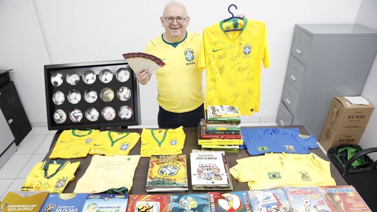 Aos 53 anos, ele é um colecionador nato, com todos os álbuns de figurinhas da Copa do Mundo, camisas lendárias, como a de 2018 autografada por todos os jogadores, além de bandeiras e até uma réplica da taça do torneio.