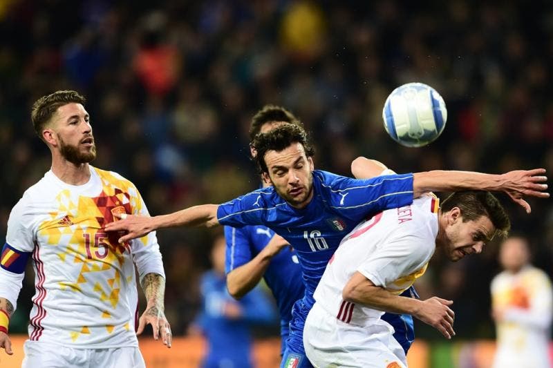 O jogo foi morno na primeira etapa, sem grandes emoções e lances perigosos. O único que tirou o ‘UH’ da torcida italiana veio logo no início. Candreva fez cruzamento perigoso e Sergio Ramos quase marcou contra, mandando na trave. O lance mais emblemático dos primeiros 45 minutos foi protagonizado pelo técnico Vicente del Bosque, que foi derrubado pelo bandeirinha e caiu na beira do campo.