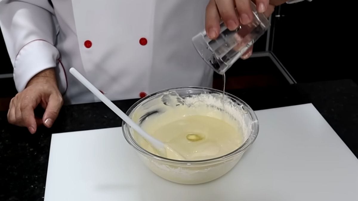 - Finalize incorporando 50ml de óleo e 1/2 colher de sopa de fermento químico (Pó Royal), misturando delicadamente.