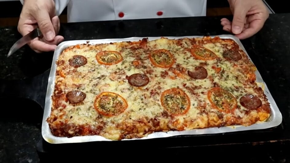 - Montagem para maior suculência: O criador sugere misturar os ingredientes do recheio (calabresa, queijo e tomate) antes de colocar sobre a massa. Essa técnica ajuda a integrar os sabores e mantém o recheio mais úmido durante os 15 minutos de forno.