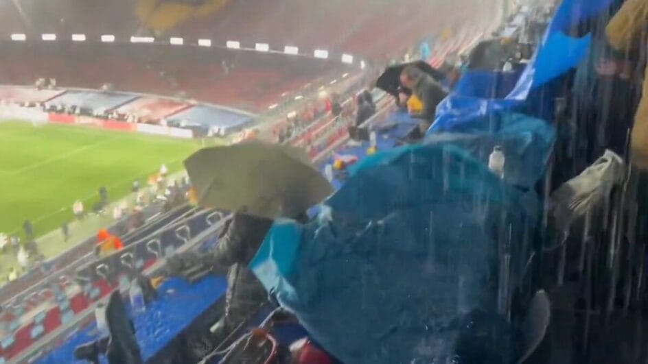 Um estádio na Europa que ainda passa por reformas estimadas em 1,5 bilhão de euros (~R$ 9,3 bilhões, na cotação atual) teve uma área significativa alagada durante partida do campeonato nacional. O jogo foi disputado nesse domingo (25).