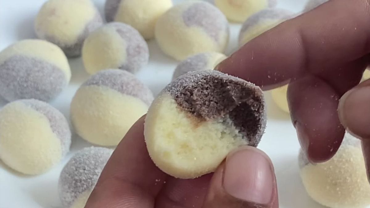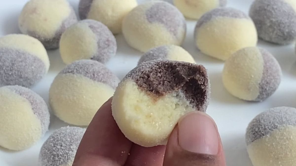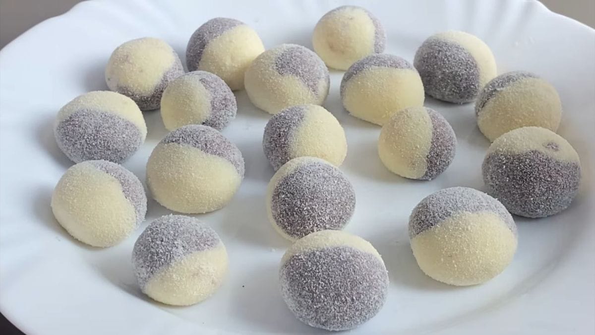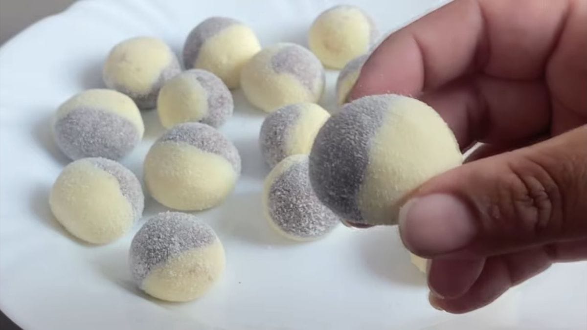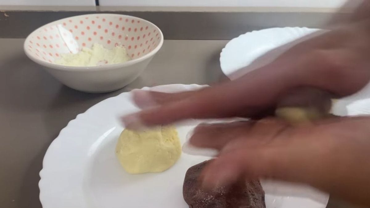 Com as duas massas, faça bolinhas pequenas, uma de cada sabor. Junte as bolinhas formando o “docinho casadinho”.