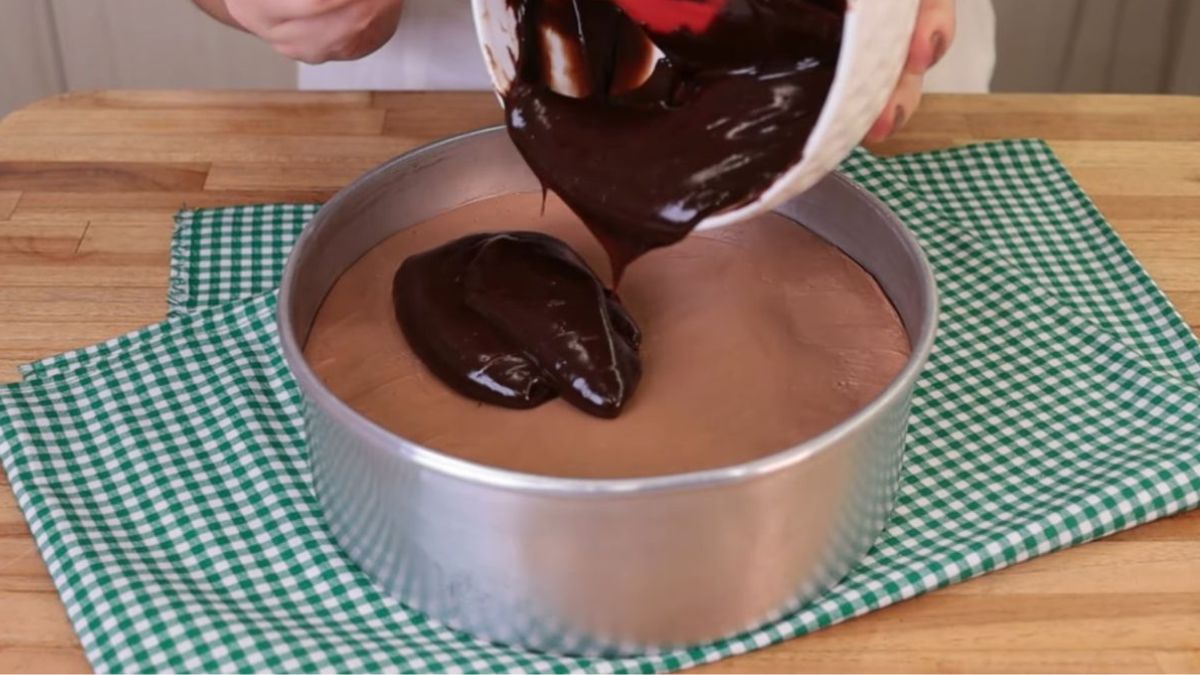 Incorpore o chocolate derretido frio ao creme até obter um recheio encorpado, consistente e homogêneo. Coloque o recheio na forma sobre a base de bolacha, nivelando com uma espátula.