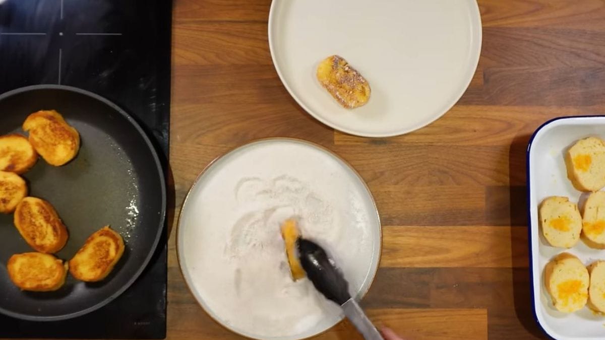 Mexa bem e coloque os pães cortados na mistura reservada, até absorver bastante. Agora, aqueça uma frigideira e unte com margarina.