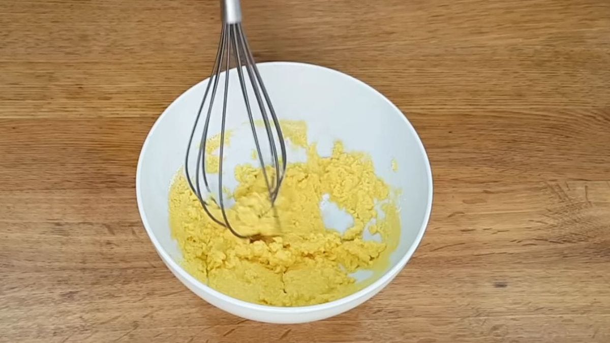 Em uma tigela, adicione o fubá e comece a hidratar com a água. Em seguida, acrescente os ovos, que fornecem proteínas e gorduras saudáveis.