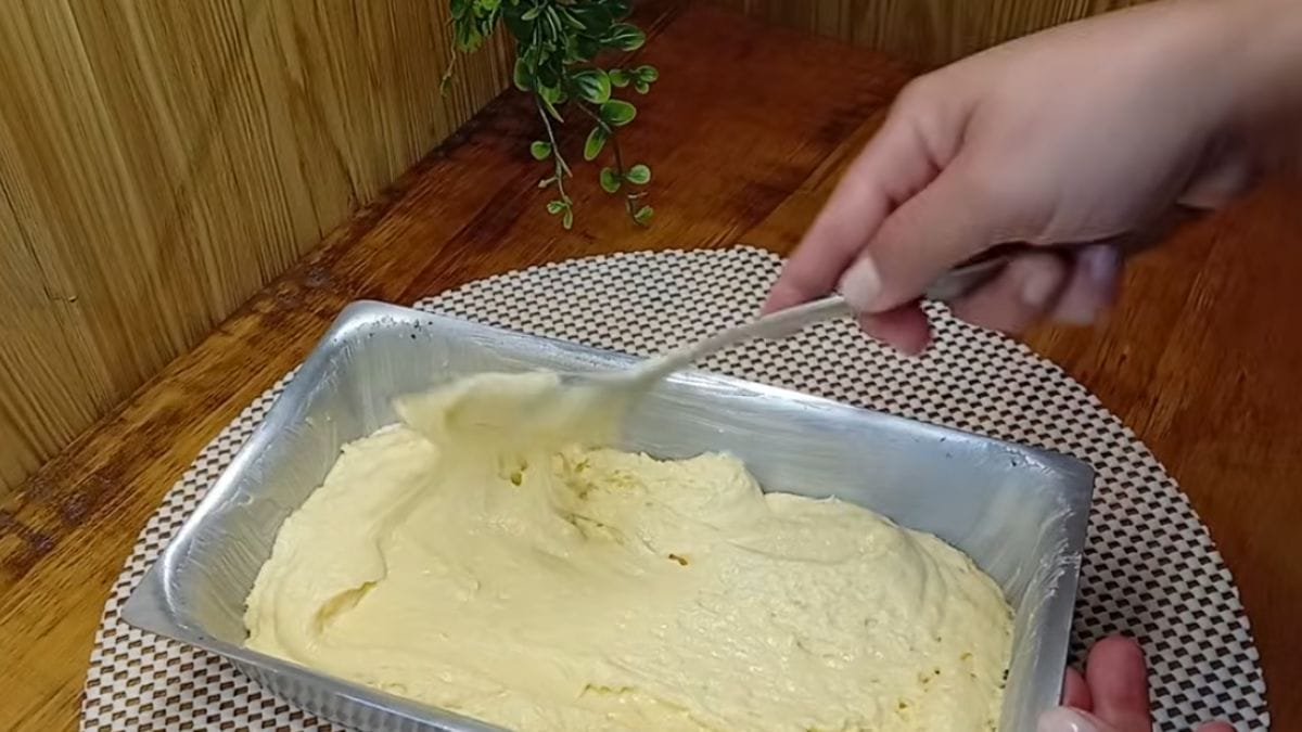 - Unte uma forma com desmoldante e acrescente a massa; Espalhe bem;