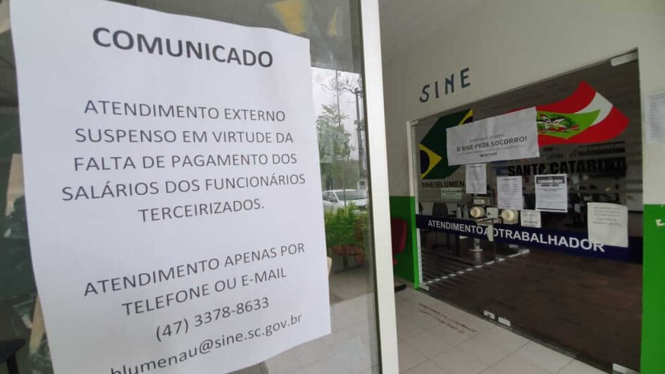 Há uma semana os cidadãos que precisam de atendimento presencial do Sine em cinco cidades do Vale do Itajaí têm encontrado as unidades de portas fechadas. O motivo é o atraso no pagamento dos funcionários terceirizados, que são responsáveis por receber e encaminhar as demandas do público. O problema afeta os postos de Blumenau, Balneário Camboriú, Rio do Sul, Itajaí e Ituporanga.