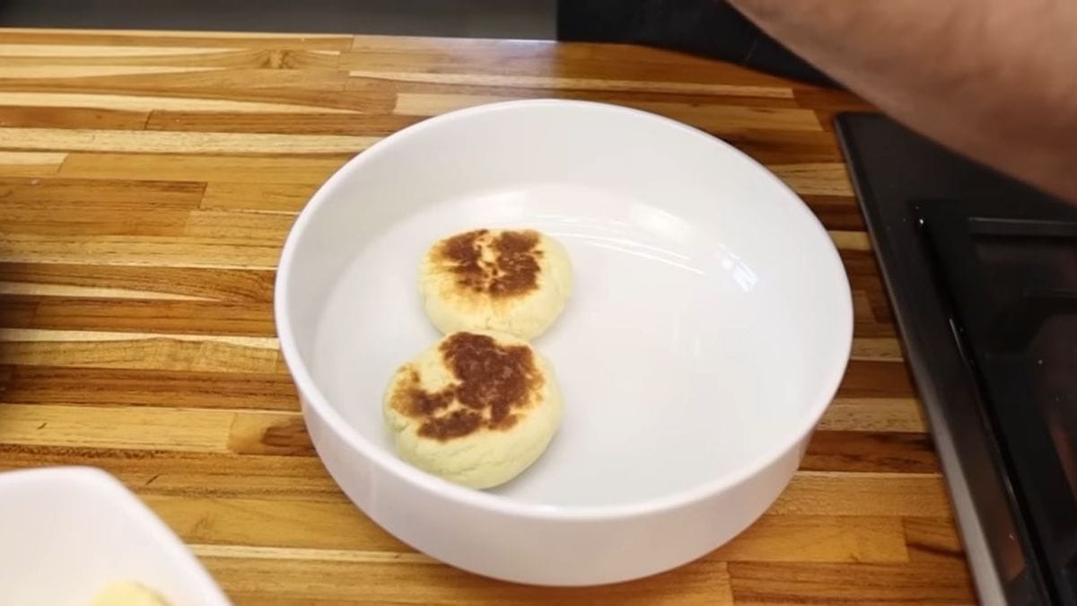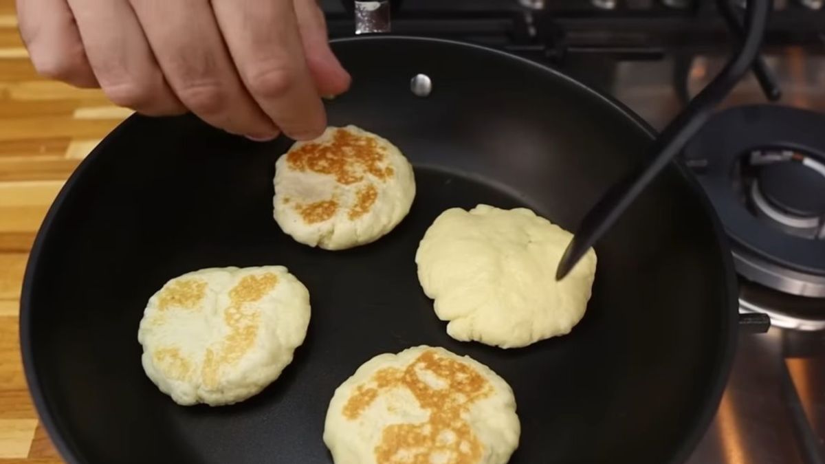 Forme bolinhas médias com a massa e achate um pouco para que não fiquem muito grossas. Em seguida, aqueça uma frigideira antiaderente em fogo baixo. Não é necessário untar.
