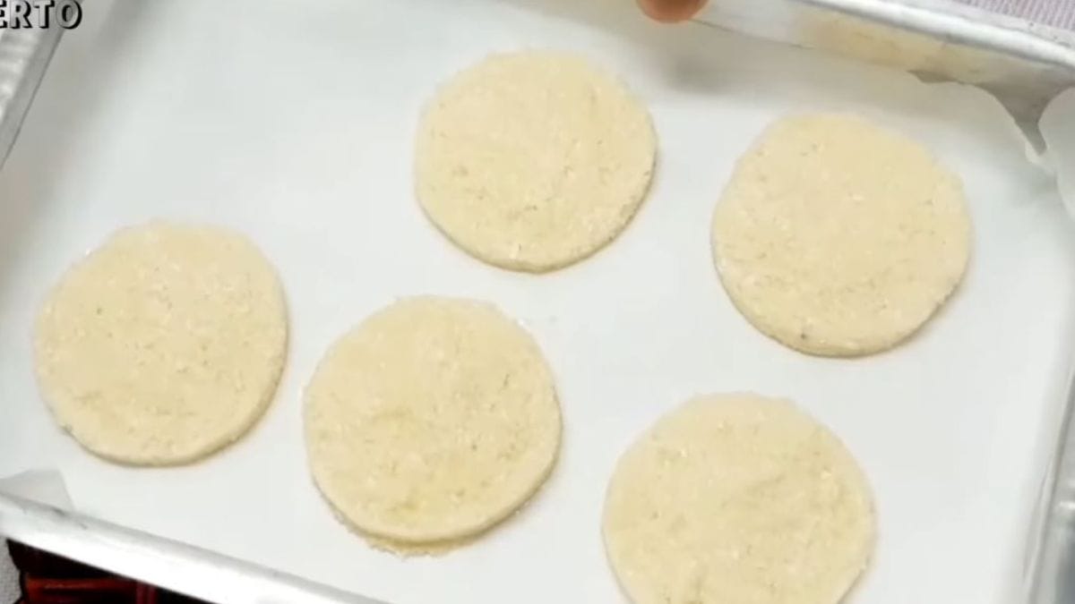 Disponha as porções em uma assadeira forrada com papel manteiga ou silicone, deixando espaço entre elas. Leve ao forno por cerca de 13 minutos, até que o doce esteja firme e levemente dourado.