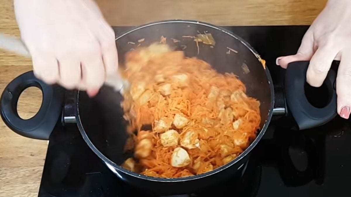 Primeiro, comece pelo recheio. Refogue a cebola com alho e sal em uma panela com azeite. Em seguida, acrescente a páprica, a pimenta-do-reino e o frango.