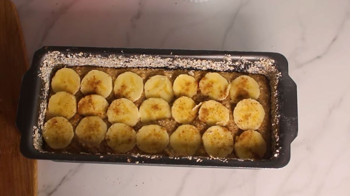 Unte uma forma média com óleo e polvilhe aveia para evitar que o bolo grude. Transfira a massa para a forma e disponha as fatias de banana por cima.