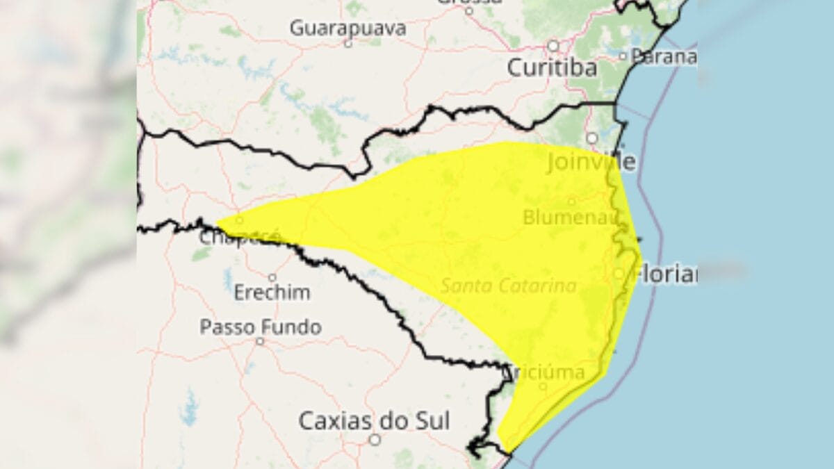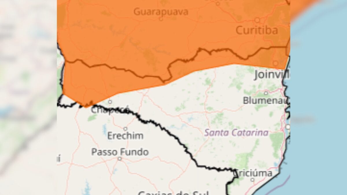 O alerta para tempestades vale para o Oeste e as regiões que fazem divisa com o Paraná, com chuva entre 30 e 60 milímetros por hora ou 50 e 100 milímetros ao dia, além de ventos intensos, que ficam entre 60 a 100 km/h, e queda de granizo.