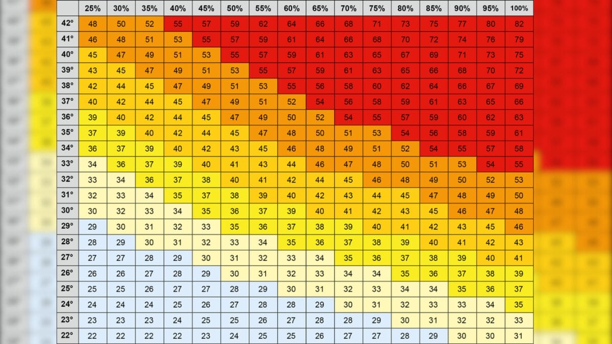 Na tabela, a coluna vertical indica a temperatura em graus Celsius, enquanto na linha horizontal, na parte superior da imagem, estão os valores da umidade. Dessa forma, com as duas informações, se obtém a sensação térmica.