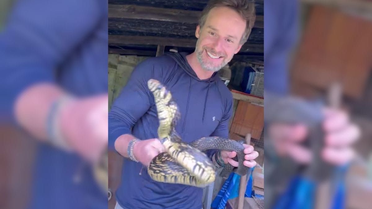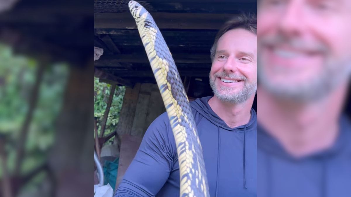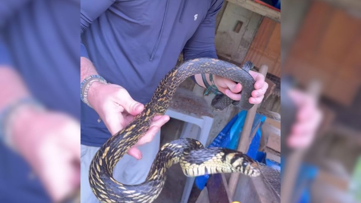 Após a retirada de dentro do capacete, Christian mostra o tamanho da serpente, que surpreende pela extensão. Normalmente, a espécie pode atingir mais de 2,5 metros de comprimento.